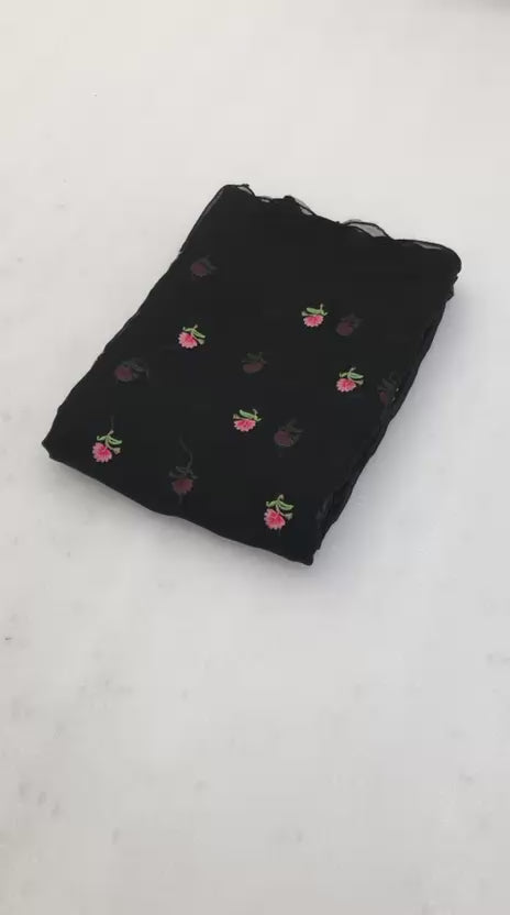 Elevate your ethnic wardrobe with this striking black saree featuring an intricate floral design. The sophisticated color palette provides a versatile canvas for both traditional and contemporary styling, while the detailed flower motifs add visual depth and elegance. Crafted for the discerning wearer, this saree seamlessly transitions from festive occasions to formal gatherings. The classic black backdrop ensures the delicate floral patterns remain the focal point, making it an essential addition to any saree collection. Perfect for those who appreciate timeless design with refined detailing.